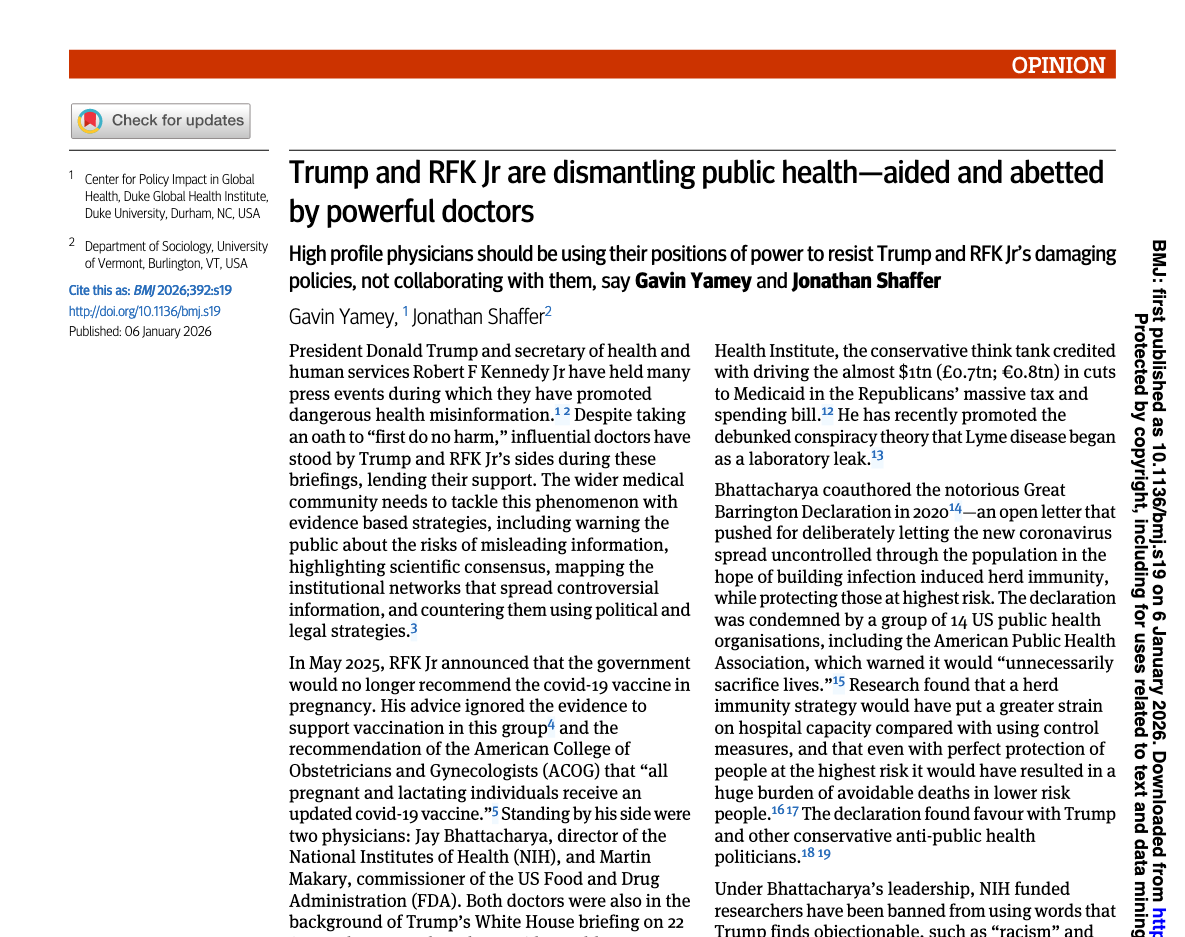High profile physicians should be using their positions of power to resist Trump and RFK Jr’s damaging policies, not collaborating with them, say Gavin Yamey and Jonathan Shaffer